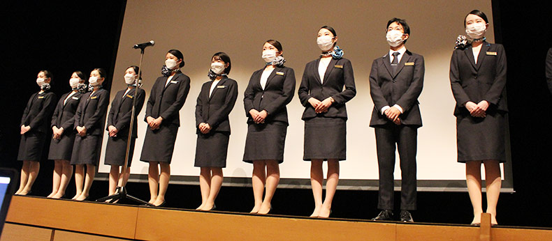 予選会を勝ち抜いた11名が「キャビンアテンダントの機内アナウンス」「グランドスタッフの空港アナウンス」2つの部門でアナウンス技術を競い合います。