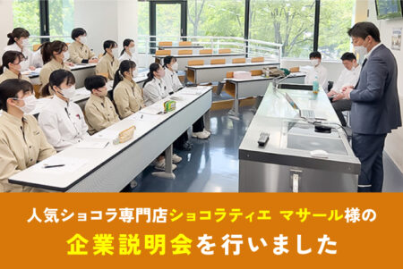 SKB製菓学科では、4年連続で内定をいただいている 『ショコラティエ マサール』様より企業説明会を行なっていただきました。 『ショコラティエ マサール』様は、 個人店としては最大規模のショコラ専門店で、 札幌市内を中心に全5店舗を運営してい...